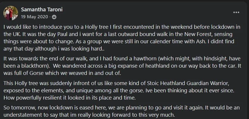 We were three trees in, exploring Ash, when Covid arrived, I had the walk Im telling you about and Holly appeared, out of order! And so, I waited and posted this a few months later in May, when it was our turn with Holly.
