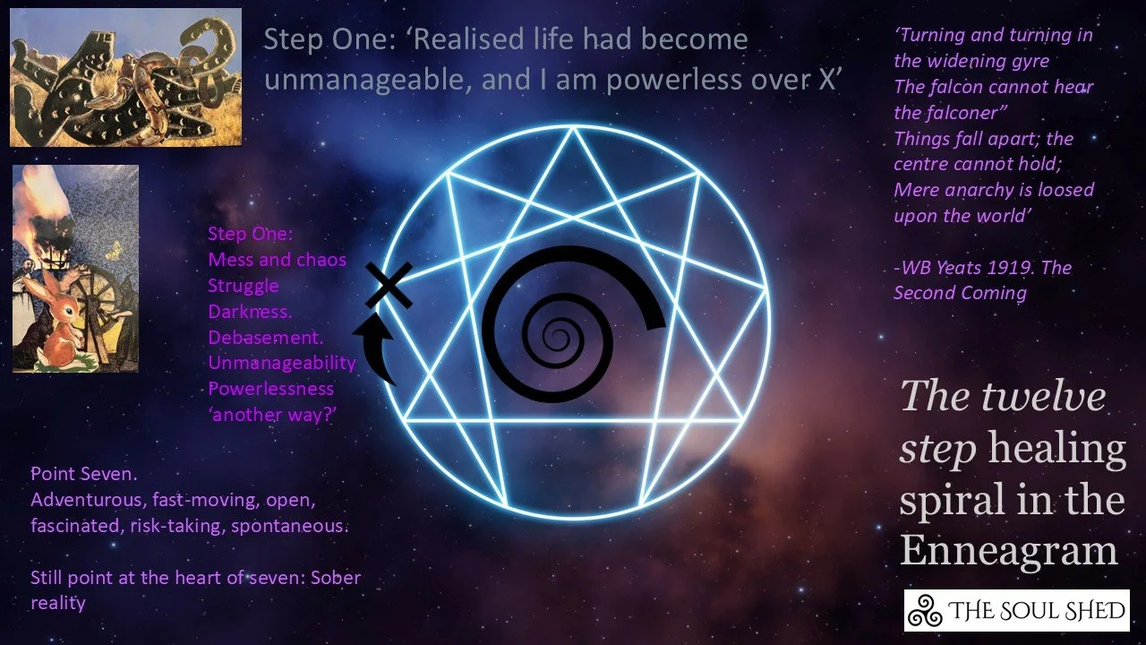 In my last post, ‘Things fall apart; the centre cannot hold’, I wrote about Step one on a twelve step recovery journey correlating with point seven on the enneagram, and you might like to begin there.